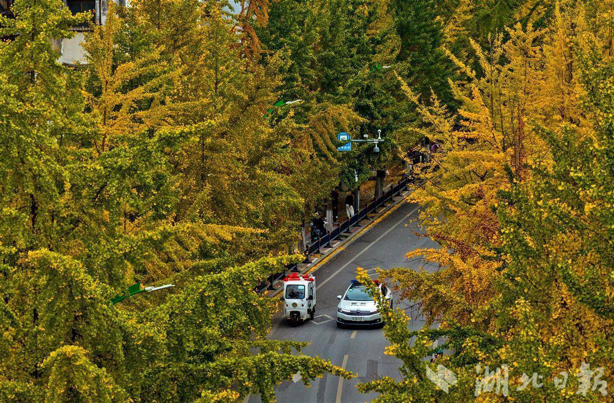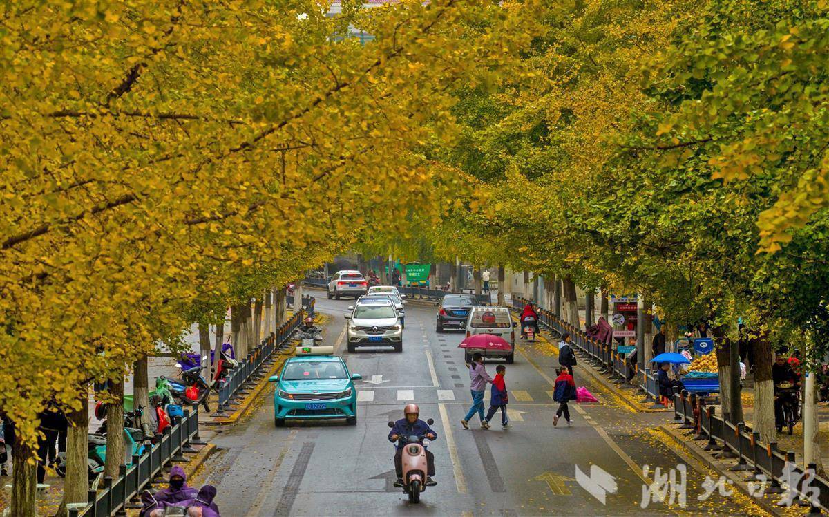 11月11日,荆州古城人民路上的银杏树迎来最佳观赏期,满树金黄与古老城墙相映成趣,为深秋的古城添上一抹亮色,吸引众多市民前来打卡留念。